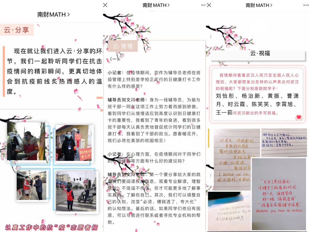 此次线上采访活动分为五个模块,即“云·分享”“云·祝福”“云·学习”“云·教学”和“云·管理”。“云·分享”主要展示同学们“宅”在家期间的生活经历。学院有五位同学参加了村内、高速口等的疫情防控志愿服务活动。其中,在小区门口做志愿者的高小涵同学认为大学生理应在特殊时期挺身而出,在村口做志愿者的龚诗钦同学则认为志愿者存在的最大意义便是为人民服务。此外,还有不少同学利用上网课外的碎片时间练字、背单词、运动打卡,更有一些心灵手巧的同学在家动手做美食。钟南山院士提出的“宅在家就是为祖国作贡献”这一观点在同学们的身上得以体现。“云·祝福”则记录了同学们对战“疫”的美好祝愿。同学们用文字、诗歌、视频等方式表达自己心中对武汉、对中国、乃至对全世界的祝福。“云·学习”记录了同学们线上学习的心得体会。同学们倡议大家应积极与老师互动,不要让网络课堂成为老师们的独角戏。“云·教学”主要围绕任课教师对线上教学的具体流程和切实体会进行采访。常微分方程刘树君老师指出,鉴于网络教学的特点,他只能“回避了艰涩的数学,但并没有回避难的数学”。为了避免高峰期网络拥堵情况,他采取了不同的应用程序教学等几套备案。教语文的刘云霞老师很早就制定好了疫情期间的教学预案以及期末考试成绩构成办法,让同学们能够提前了解到具体科目的考核标准和学习任务。“云·管理”主要通过采访学院相关老师以了解学院的疫情防控工作。经采访,同学们了解到学院成立了疫情防控小组,建立了疫情防控日报群,重点学生关心爱护群、值班群等,对于学生的健康日报打卡工作,学院不仅做到确保数据的准确,而且对数据异常情况及时跟踪,努力做好学生的思想政治教育工作和心理辅导工作等。