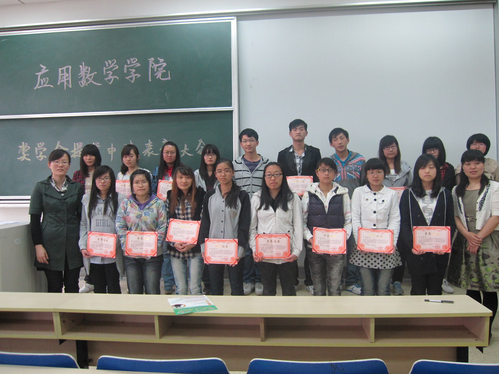 由院团委书记龚莉红老师为这十八名同学颁发了获奖证书并且和龚莉红老师以及张文文老师拍照留念。