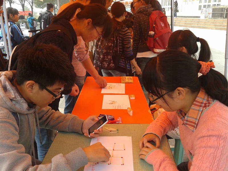 本次校园寻宝大赛经过一个多月的紧张筹备,于11月9日下午两点正式开始。参赛人员三人组成一个小队,分批进行比赛。每一批有四个小队根据抽签确定各自的寻宝路线和所代表的颜色,然后寻找与自己队伍颜色相同的卡片进行闯关,达到终点用时最少者则获胜。每个关卡都设有工作人员暗中监督,以保证比赛的公平性和参赛人员的安全。每个小分队在起点将魔方转出一个面后即可出发,寻找神秘的“财宝”。比赛过程中,参赛小组热情高涨,纷纷开动脑筋,仔细搜索着校园隐藏着的寻宝信息。本次比赛每条路线都设有五个关卡,共有四条不同的路线,同时每个关卡的题目都较难,形式多样,内容丰富,考察参赛选手不同方面的能力和灵活程度,极富益智性。但是几乎所有的参赛小组都独立地完成了寻宝任务,成功地找到隐蔽性较强的信息卡片,顺利到达终点,没有过度依赖于工作人员的加时提示。最后经过一个多小时的紧张比赛,吉欣悦组幸运夺冠,获得精美的木质台灯。紧随其后的是亚军董爱鑫组,获得可爱的龙猫抱枕;扈华晓组获得精美陶瓷杯。万雯组、夏文豪组和熊政组摘得三等奖,获得文具用品。其余参赛选手都获得一份小礼物。