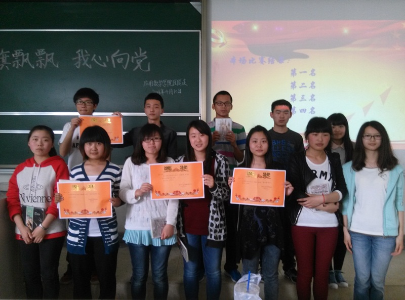 团总支主办,2012级和2013级团支部协办的“红旗飘飘 我心向党”党章知识竞赛的决赛圆满举行。 赛前,全体同学起立合唱了《红星闪闪》。接着,比赛正式开始。本次竞赛分为必答题、限时题、风险题三个环节。各代表队基准分为100分,在此基础上通过竞赛增减,比赛结束依据各队得分高低排定名次。金数1301班代表:戴元、陈璇、李响,应数1301班代表:丁沁、严硕、袁鑫,应数1201班代表:卢秀琴、赵羽浦、申新鹏,应数1202代表:丁云峰、宋利平、田步甜。 第一环节,必答题:每队每人1题,按队员场上座位顺序,从左至右,依次为1-3号队员,每题10分,答对加10分,答错扣10分;必答题按每队1-3号队员轮流作答,其他队员不得代为作答或提示,否则扣分;选手答题时间从主持人把题目读完后开始计时,不得超过20秒,超时扣分。 第二环节,限时题:各参赛队选出1名选手作答,限时60秒;在60秒限时里,答对一道加10分,其他两名选手不可提示 在严肃的比赛期间,穿插了活跃气氛的串场小游戏:首先是红歌接唱,台下观众们自愿上台,虽然有些歌曲离我们这个时代很遥远了,但还是有同学能准确接唱出来。后来是经典的“谁是卧底”的小游戏,观众们非常热情地参与游戏,最后由参赛小组中选出各代表参与游戏,申新鹏成功掩盖了自己“卧底”的身份,成为最后游戏赢家,并取得了比赛的五分附加分,而输游戏的其他选手则各自选了不同的搞笑惩罚方式,串场游戏在大家的一片笑声中结束。 游戏过后则是决定命运的第三环节,风险题:风险题分为10分、20分、30分三类,每类各6题,四支队伍抽签分成两组,一队为同组的另一队选题,若对方答对,则对方得相应分数;若对方答错,则选题的一队得相应分数。每队回答三道题;参赛队内部可在相互讨论后,选派一名选手起立作答,答完题应说"回答完毕"后方可坐下,“回答完毕”后不得再补充作答;风险题不按分值区别计时,讨论时间30秒,答题时间30秒,超时无效。 依据以上规则,比赛平稳进行,经过各班激烈角逐,应数1201班与应数1301班基本打成平手,最后应数1201班凭借小游戏中获得的五分额外附加分荣登榜首,而应数1301班紧随其后,应数1202班取得了第三的成绩,金数1301班则退居第四。 在最后,获奖班级班长上台领奖并合照,圆满的结束了本次的知识竞赛。 这是一次比较成功的知识竞赛,答题的同学和台下的观众都接收到了党组织精神的正能量,了解了党章的内容,以及党对时代的最新成果有了更多的认识,这次竞赛也培养了同学们对党的历史与精神有了更加浓厚的兴趣,成果十分喜人。