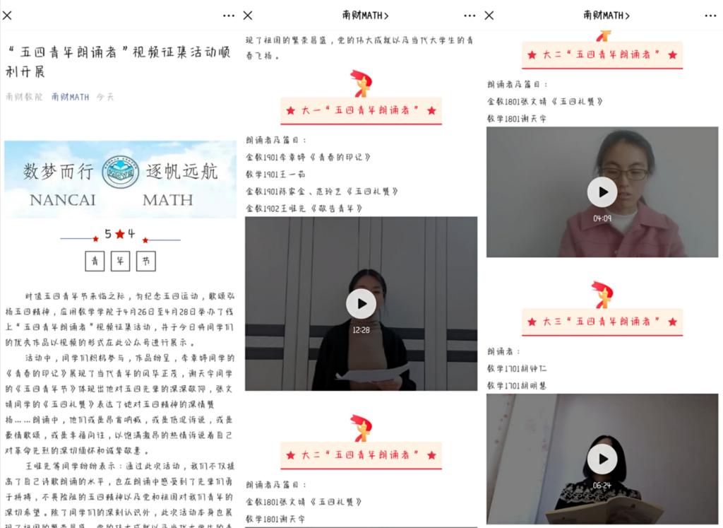 于4月26日至4月28日举办了线上“五四青年朗诵者”视频征集活动,并于5月1日将同学们的优秀作品以视频的形式在学院公众号进行公布。