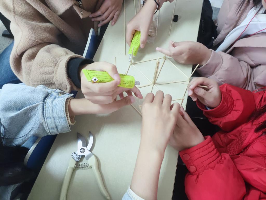 在负责人分配好小组和工具之后,同学们跃跃欲试,纷纷开始着手制作自己喜好的模型。很多女生选择了制作摩天轮,摩天轮制作复杂,很难制作,但这并没有妨碍到同学们的热情,女生组互相鼓励,在大家的齐心协力之下,摩天轮终于初见雏形,虽然由于时间紧张未能制作完成,但同学们都体会到了制作过程的快乐。与此同时,男生组也展开了他们的模型制作,不同于女生,男生们更倾向于搭建正四面体这样难度较小的模型,搭建成功后也开始尝试制作汽车这类更有挑战性的模型。