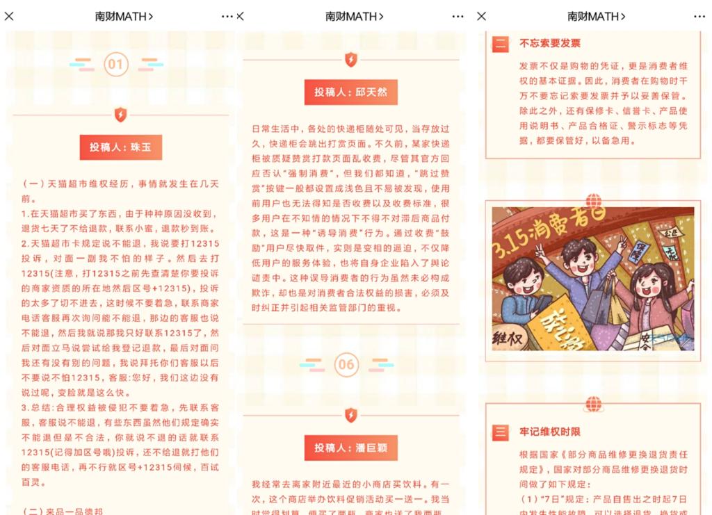 开展了“3·15”线上投稿消费者权益小故事活动,并在3月13日将同学们的投稿以分享会的形式在学院公众号进行推送。