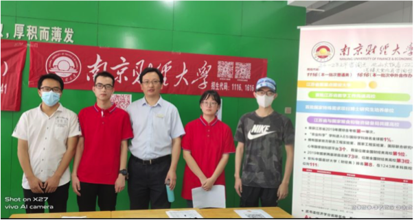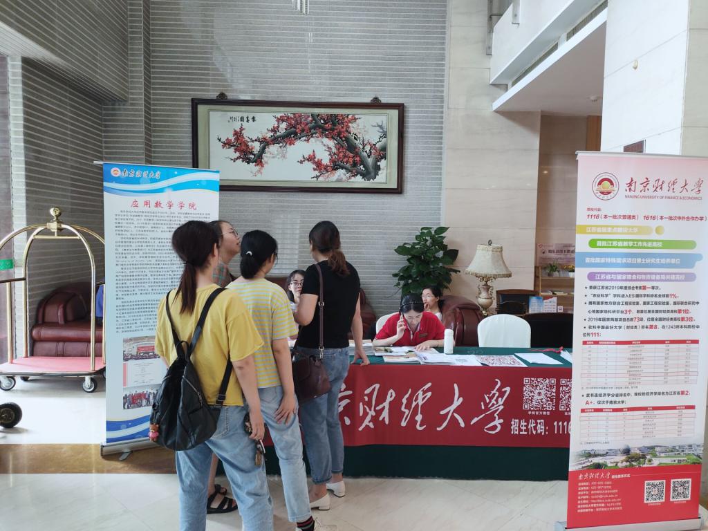 的招生立牌,张贴了招生宣传海报和信息收集二维码。准备工作就绪以后,就陆续有一些学生和家长来到现场咨询。杨靖三老师和吴波老师分析了这些考生的分数与等级,并结合考生的报考意向和发展方向,推荐了适合考生的专业,也介绍了南财的学科专业特色,让考生和家长对南财的实力和知名度有了进一步的了解。