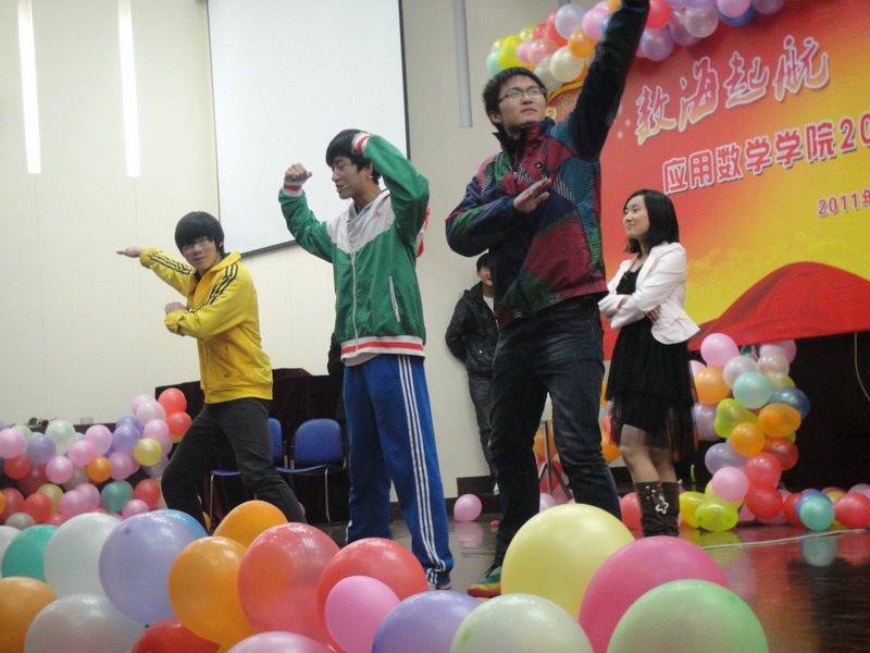 第三乐章——欢乐一家亲将晚会推向了高潮,男生302宿舍为我们带来了集体舞《大爱302》,由濮阳腾飞、闵济康等人倾情奉献,他们在结婚进行曲的伴奏下两两上台,引起台下欢呼阵阵,他们先是跳起了可爱的波斯猫舞蹈,接着又跳起了经典的nobody,他们到位的动作,可爱的表情让大家忍俊不禁,欢笑声连绵不绝。最绝的,还要数他们的“千手观音”表演,他们默契的配合和到位的表情获得了满堂彩,大家纷纷拿出相机拍下这一经典的画面。相声《胡椒面》是许多人眼中的经典,今天,高正扬、高任、贾芸芝同学重新为我们演绎了这一段经典,高正扬和高任生动的动作,传神的表情又让整个会场充满了笑声。曾获得应数学院“十佳歌手”赵元琨学长为我们带来了一首《can you feel my world》,他充满磁性的嗓音感动着我们每一个人。压轴节目华尔兹《原来你也在这里》由吴弘、秦川等5组同学为我们带来,他们让我们感受到应数学子们的风采,朝气和活力,整场晚会在他们的鞠躬后,在《难忘今宵》的歌声中完美结束。