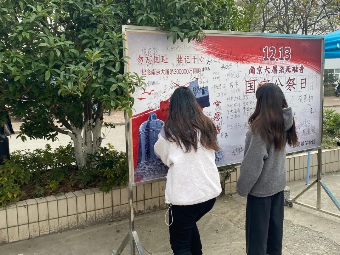 学生会在中苑外场举办了“和平许愿墙”签名悼念活动。在此次活动中,所有海报都以暗色调为主,展示了活动的庄严。很多准备去食堂就餐的同学停下脚步,在展板上签上自己的名字,表达对南京大屠杀死难者的祈福以及对世界和平的美好愿望。活动结束后,学院号召同学们一起在室内为南京大屠杀的遇难者们默哀,以此来缅怀83年前惨遭侵华日军屠杀的30万遇难同胞,希望同学们铭记历史,勿忘国耻。