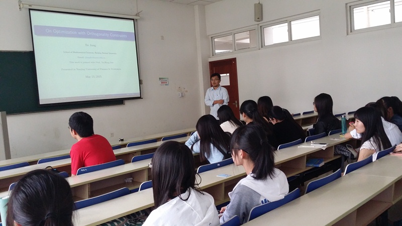 姜波博士首先介绍了最优化理论的起源,并给大家讲解了在数学学习中涉及到最优化理论的应用方向。他说,最优化问题一直渗透于数学学习中,包括微积分数学分析求极值以及高中所学的线性规划的问题,此外,最优化还涉及工程控制、最优控制、系统科学等。姜波博士从问题、想法以及计算三个方面为同学们具体分析了最优化问题,并指出用来解决的方法包括数学规划、排队论、决策分析、模拟技术等等。