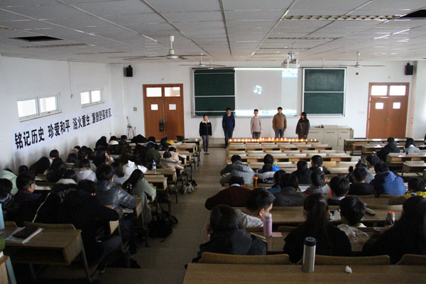 此次国家公祭日主题活动由观看短片《南京公祭日》拉开序幕,同学们在教室点燃蜡烛,祭奠在南京大屠杀中遇难的同胞,怀着沉痛的心情观看了活动宣传片。随后由5名同学进行配乐诗朗诵《少年与中国说》,表达了广大的青年学子奋发图强,振兴中华的豪迈之情。此后,同学代表结合课堂所学的中国近现代史知识和自身学习经历,分享了不忘历史,努力学习,报效祖国的感想与决心。最后全体同学举行”铭记历史、珍爱和平“签名活动。