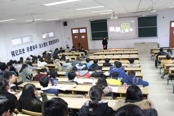 在公共教学楼221教室,组织学生开展“铭记历史,勿忘国耻,努力学习,坚定前行”国家公祭日主题教育活动。