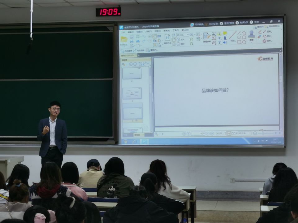 邀请高顿教育的郭锐老师为大家做了关于品牌打造的培训。在培训中,郭老师从品牌的设计、定位和推广几个方面阐述了品牌打造中的注意事项,其中重点阐述了“品牌口碑打造”与“品牌差异化”这两个问题,并引入了“客户精准需求+最优资源+最用心的客户服务=令绝大多数客户满意的产品=行业内最好的口碑”公式及品牌人群定位的“二八法则”。不仅如此,郭锐老师还采用了互动问答的方式调动同学们的积极性,并通过大量的企业实例帮助同学们理解。同学们在培训中收获了许多关于品牌打造的知识并坚定了为品牌日打造更好作品的信念。