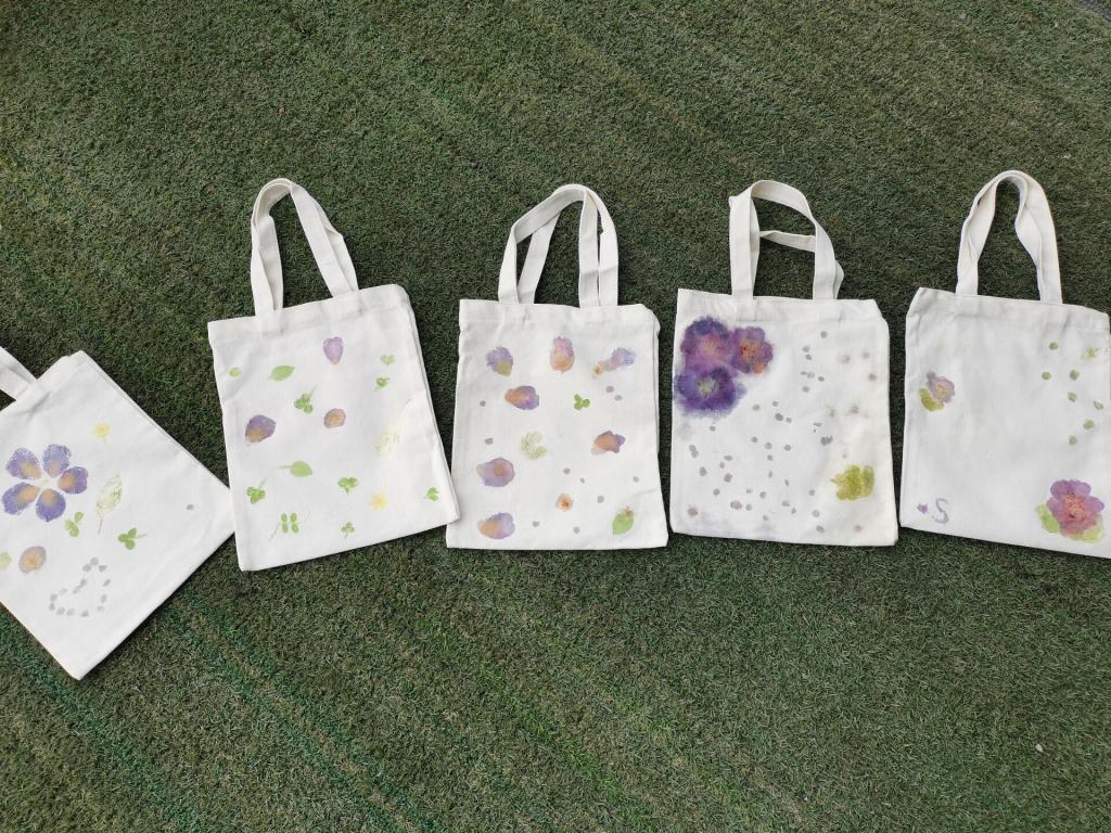 通过拓染,叶片的形状与颜色留在了白色帆布包上,这便是春的印记。同“落红不是无情物,化作春泥更护花”一般,植物拓染又何尝不是对落红的一次再利用呢?这不正是植树节传达出的爱护环境、改善生态的环保理念吗?