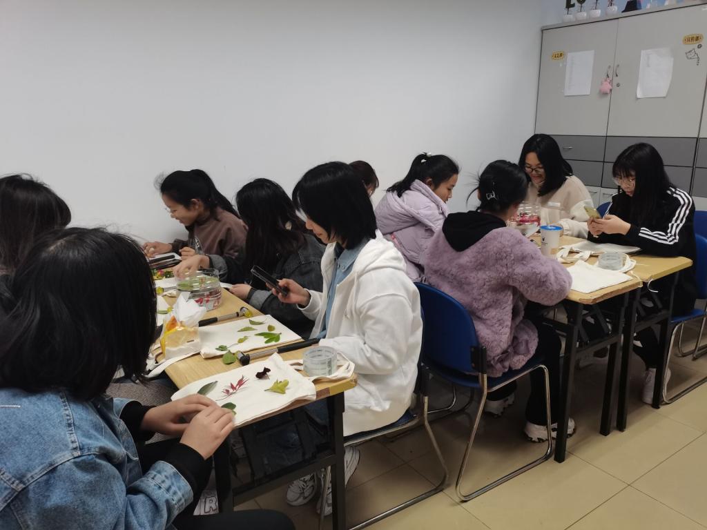 在仙林校区德业楼506活动室开展了以“发现绿色之美,拓染美好记忆”为主题的植物拓染活动。
