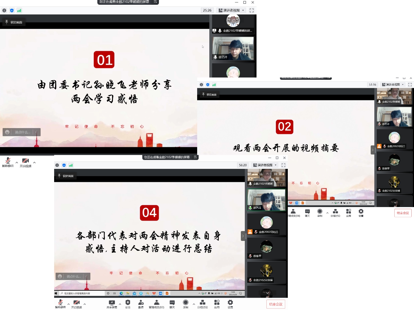 会议初始,孙晓飞老师向同学们介绍了两会的进程和相关内容,详细讲解了5个必由之路和5个战略性有利条件,建议同学们多关注热点问题,紧跟时事,潜心学习之时注重个人素质与能力的全方面发展。接着,院团委7个部门的代表成员针对网络安全、公共卫生、乡村振兴、教育变革等热点议题发表自身感悟。针对大学生就业创业问题,刘佳仪同学说到:“希望应届毕业生在享受国家就业优惠政策的同时不要钻政策和法律的空子,也期待国家就业相关政策能够愈加完善。天下兴亡,匹夫有责!作为新时代的大学生,我们生在国旗下,长在春风里,我们的肩上担着时代赋予我们的任务,我们有责任和义务学习并践行两会精神,认真学习,努力工作,开拓创新,共建美丽家国。”