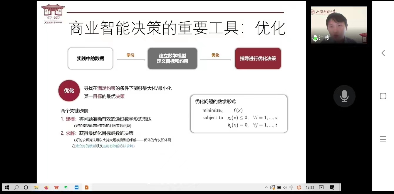 邀请,上海财经大学江波教授通过腾讯会议作了题为“收益管理中的优化模型与方法”的线上学术讲座。学院硕士研究生、部分教师参加了此次讲座。