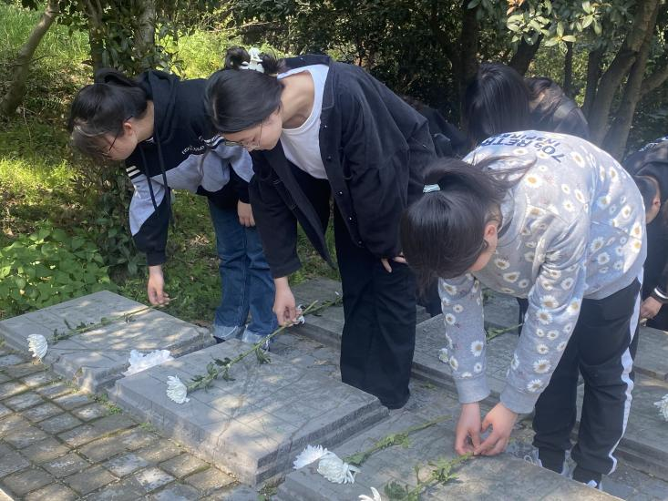 青山有幸埋忠骨,碧海蓝天聚英魂。活动当天,同学们手持白菊和自制的纸花,登上了紫金山北麓的航空烈士公墓。纪念碑下,同学们用默哀的方式致敬英烈的牺牲与奉献。英雄长眠,吾辈常念!接着,大家前往刻有烈士生平的石碑前,轻轻把花放在石碑上,肃立默哀,向先烈们表达自己的崇敬之情。