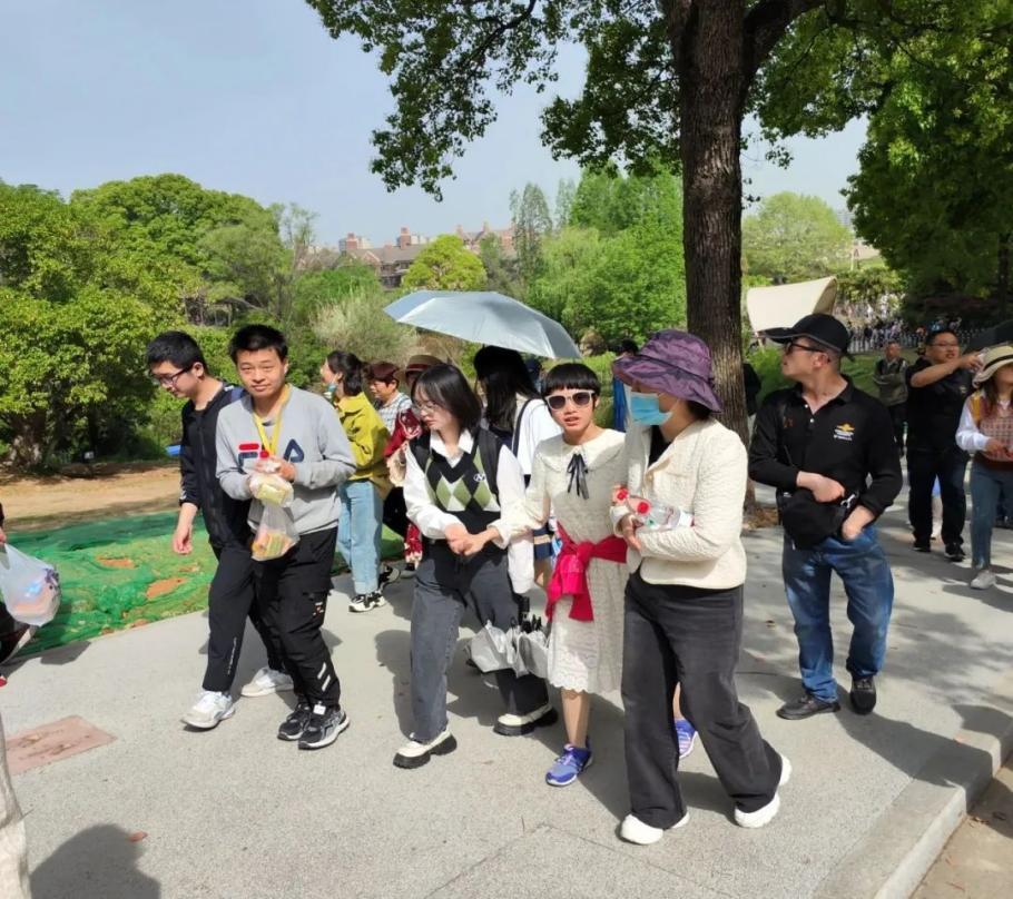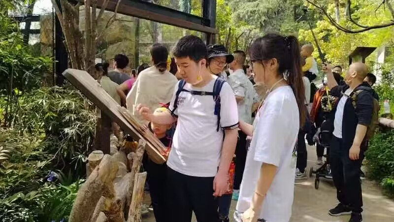 当天早上8:30,志愿者们早已到达南京市红山森林动物园门口进行签到并领取物资,工作人员为每个学员家庭分配志愿者进行组队,志愿者们热情地与学员及家长沟通交流,亲切地拉着学员的手,引导他们在动物园内有序游览。在三个多小时的活动时间里,志愿者们引导学员依次参观园内展馆,欣赏沿途景色,向他们讲解园内憨态可掬、萌趣十足的小动物。参观过程中,有的学员感到疲惫,志愿者就陪他们坐下来喝喝水歇歇脚;有的觉得背包太重,志愿者便主动帮助他们背包;想要拍照时,志愿者就贴心的为学员拍摄各种合照。志愿者们将“奉献、友爱、互助、进步”的志愿者精神落实到温暖的陪伴活动中。