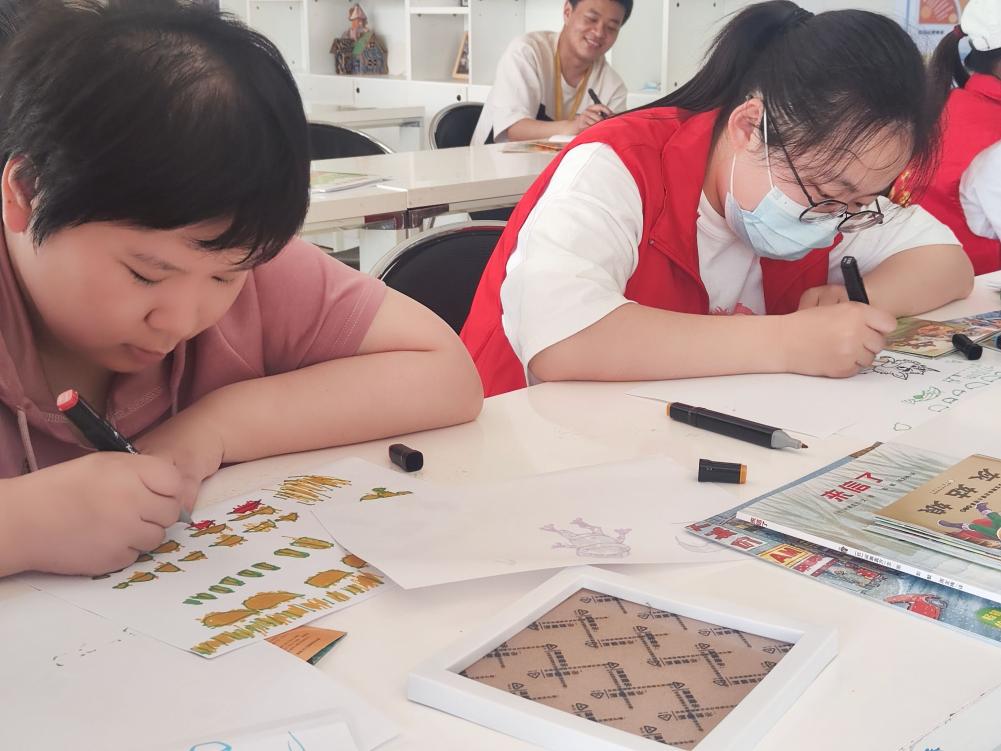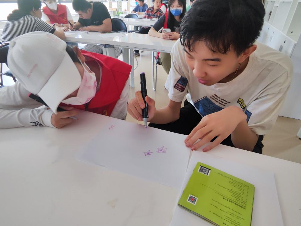 活动中,志愿者向中心的学员捐赠了绘本、故事类图书73本,向中心工作人员捐赠艺术、生活类期刊47本。内容丰富、种类繁多的书籍承载着志愿者对学员和中心工作人员的深情关爱,很多学员在拿到书籍后就迫不及待地开始翻阅,志愿者们趁机也加入到阅读行列中,志愿者们用心用情专注的阅读将学员拉入到跌宕起伏的故事情节之中,大家的目光追随着志愿者,手中捧着的书本成为彼此心灵互动的桥梁,每个人都沉浸在书本中,陶醉在美妙的故事情节里。最后,志愿者和学员一起拿起画笔为线稿上色、绘制图画。一笔一划,一临一摹,在志愿者的帮助下,一个个活灵活现、五颜六色的卡通人物呈现在学员面前,让他们觉得无比新奇又充满自豪。活动接近尾声,志愿者和学员们合影留念,并向学员们致以真诚的祝福。