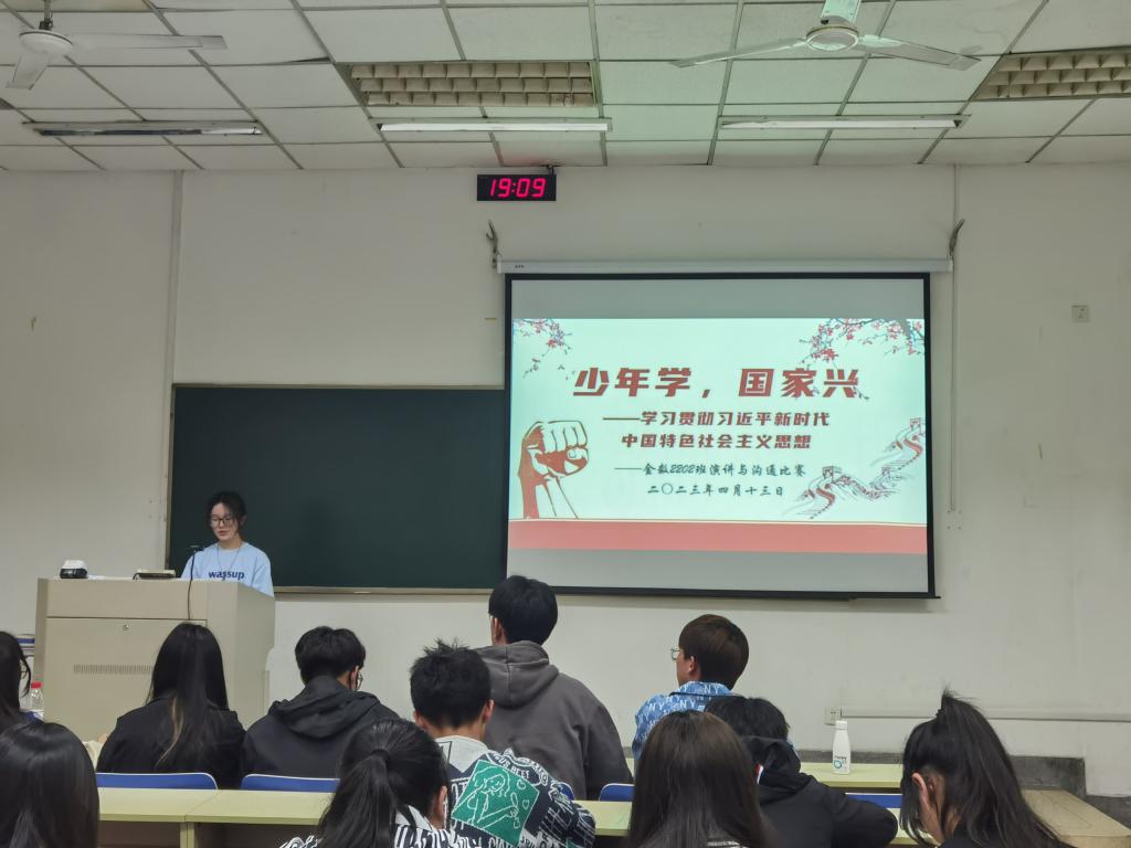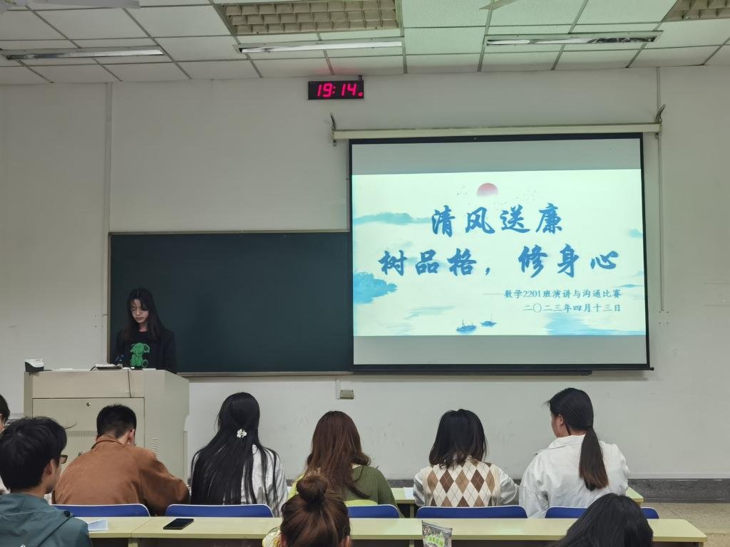 金数2201班、金数2202班和数学2201班分别以“以党的二十大精神为指引,筑梦新时代,奋进新征程” “少年学,国家兴——学习贯彻习近平新时代中国特色社会主义思想” “清风送廉,树品格,修身心”三个主题进行比赛。上台演讲的同学都争取做到了脱稿演讲,谈吐大方、逻辑清晰;台下准备的同学一边认真倾听,一边积极准备,大家都希望能在短暂的三分钟里展现出自己最好的一面。朱美嘉同学讲述了党的二十大精神对自己的指引,从对青春的迷茫到对前路的笃定,她声情并茂的演讲令人赞叹不已,也让党的二十大精神更加深入人心。刘伊曼同学以文化自信为主题,引经据典,用充满活力的语言向大家展示了“胸中有丘壑,立马振山河”的青年壮志。解尧同学在宣传廉洁文化的同时,通过一个个发人深省的案例,号召广大同学树立廉洁品格,清清白白做人,干干净净做事。
