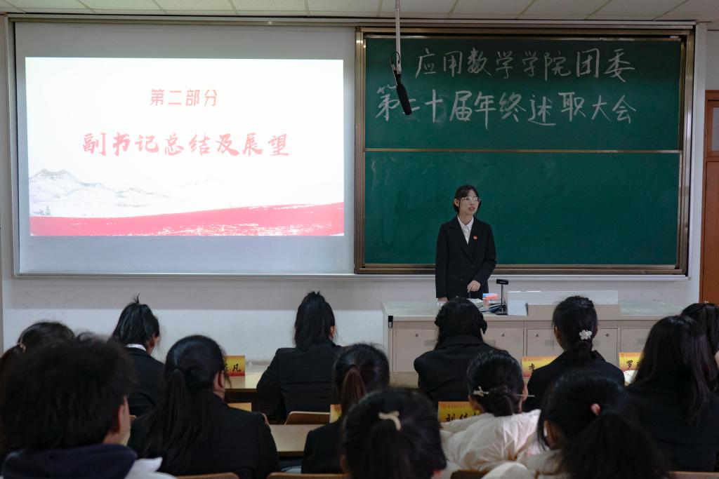 本次大会包括各部门部长工作总结、副书记总结与展望、各部门干事代表发言、年终表彰四个议程。会议伊始,各个部门部长从本学期工作成果展示、工作问题总结以及对未来工作的展望三个部分展开述职。答辩环节,副书记对相应部门的工作提出肯定并给出建设性意见。学院团委三位副书记依次上台发言,总结团委本年度的工作情况,对团委成员的工作态度和任务完成情况予以肯定,并就学院团委接下来的重点工作做出了布置和安排。各部门干事代表发言,各代表讲述了自己在加入团委后的心路历程、对自己未来的展望并表达了对学院和团委的感谢和祝福。
