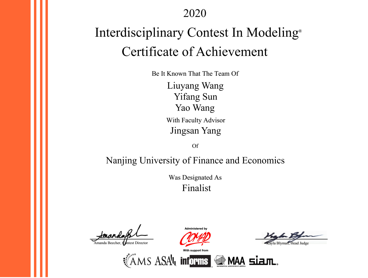 学子参加2020年美国大学生数学建模竞赛获奖名单: