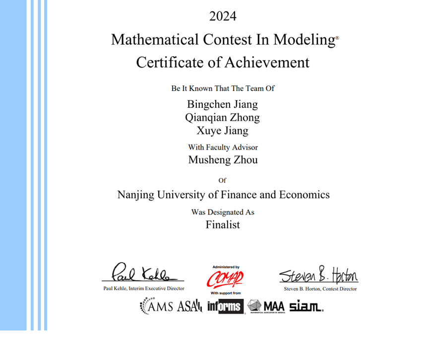 学子参加2024年美国大学生数学建模竞赛获奖名单: