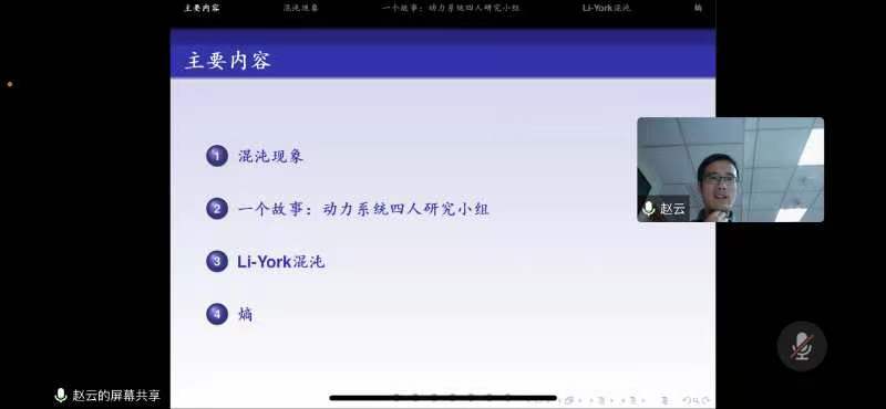 讲座以生活中的案例介绍了混沌现象,讲述了一个动力系统四人小组的故事,通过定理,证明了信息论中香农熵的表达形式。最后,赵教授介绍了苏州大学动力系统研究中心的相关情况,并欢迎同学们报考苏州大学研究生。