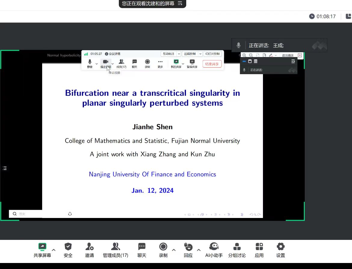 邀请,福建师范大学沈建和教授在腾讯会议作了题为“Bifurcation near a transcritical singularity in planar singularly perturbed systems”的线上学术讲座。院部分教师和研究生参加了讲座。