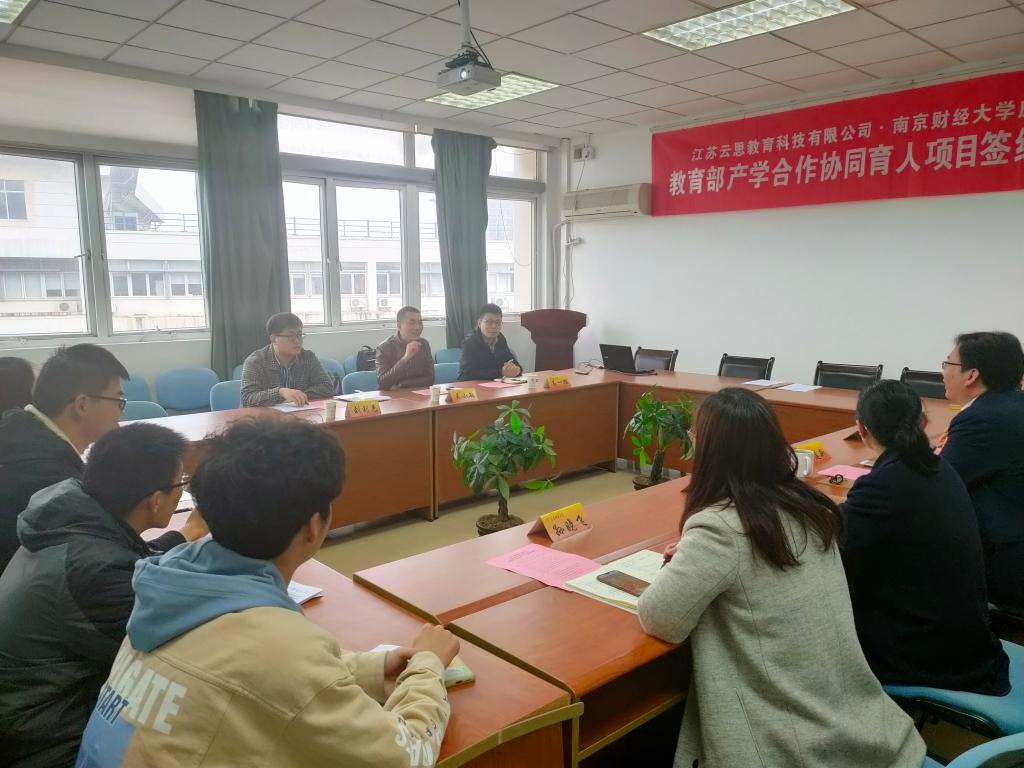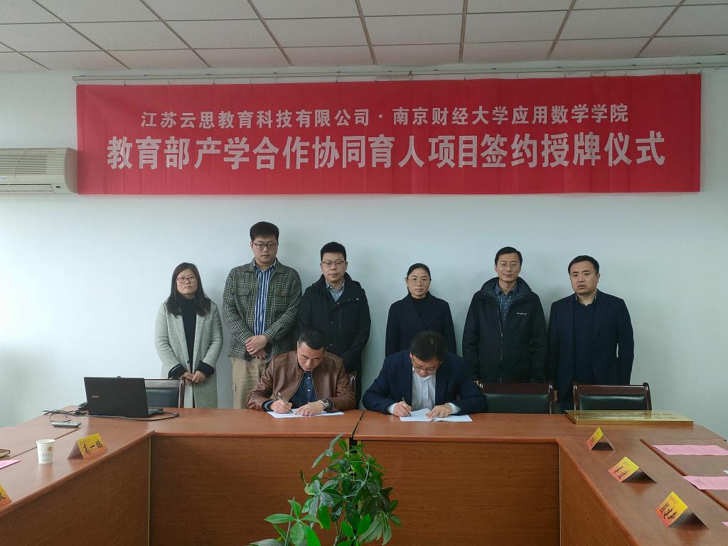41日下午,明星ai换脸 在仙林校区德业楼534会议室举行教育部产学合作协同育人项目签约授牌仪式。江苏云思教育科技有限公司总经理吴小敏、院校合作总监高一鹏、教研副总监刘钊邑,明星ai换脸 党总支书记殷建新、副院长宋瑞丽、应用数学系主任吴波、经济数学实验室主任杨靖三,以及明星ai换脸 部分学生代表参加了仪式。明星ai换脸 党总支书记殷建新主持此次签约授牌仪式。