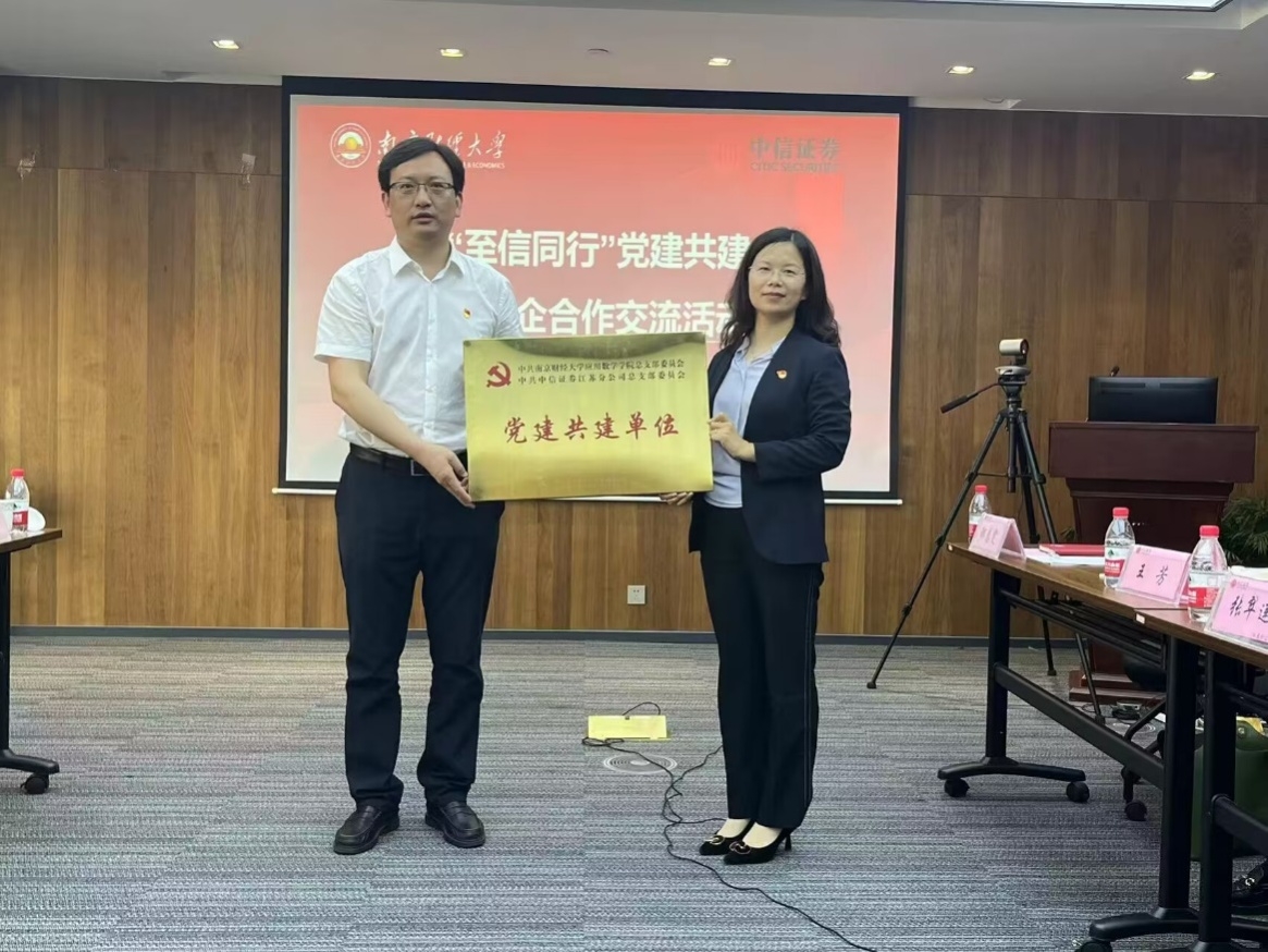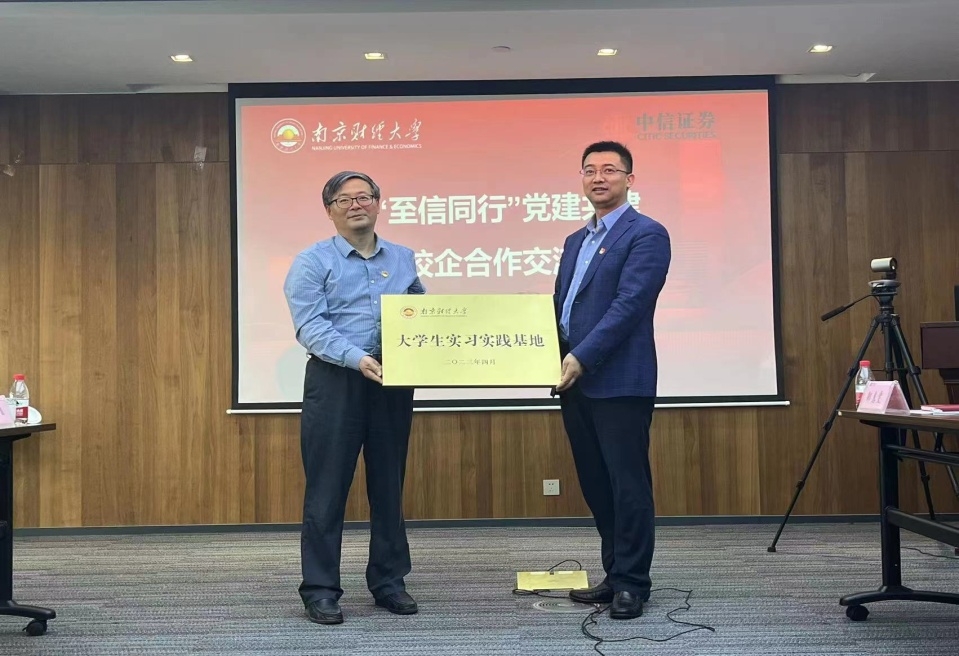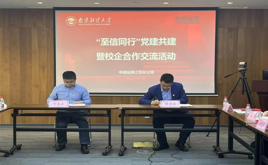 中信证券江苏分公司党总支副书记、副总经理张翠莲带领大家学习《习近平新时代中国特色社会主义思想专题摘编》中的“推动经济高质量发展”部分,开启双方党建共建活动。领学结束后,双方就深化校企合作、党建共建、人才培养、实习基地建设、企业导师进校园、职业规划教育等方面进行了深入交流和讨论,并达成共识。最后,双方签订党建共建协议和校企合作协议,举行“党建共建单位”和“大学生实习实践基地”授牌仪式,并合影留念。