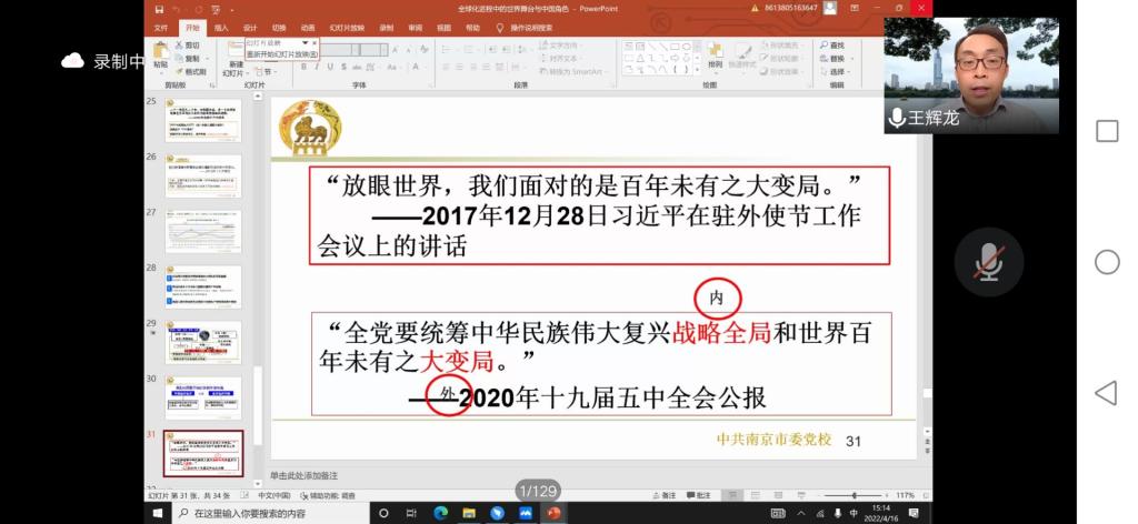 4月16日下午,南京市委党校市情研究中心主任王辉龙教授应邀于线上作了题为“全球化进程中的世界舞台与中国角色——从《共产党宣言》说起”的讲座。讲座由明星ai换脸