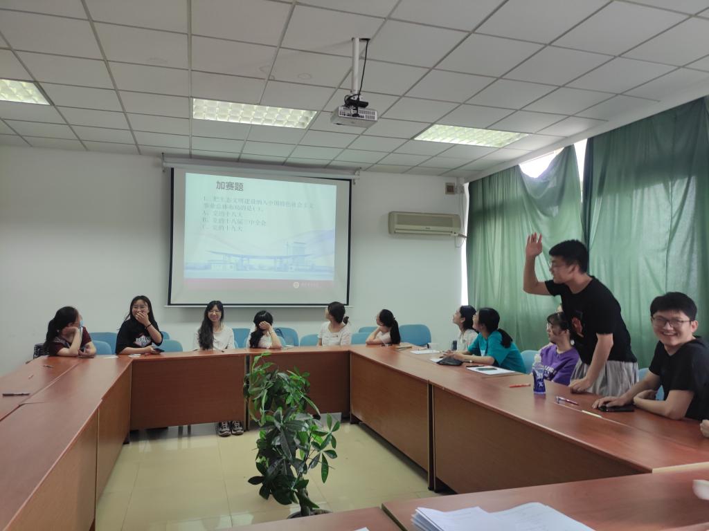 竞赛分两个部分,第一部分为笔试形式,内容涵盖中国共产党成立百年来的革命史、新中国史、改革开放史、社会主义发展史等,全面考察支部全体党员党史学习教育阶段性的学习成效。作答完毕之后,现场由同学们互相批改计分,重新温习知识的同时彼此互相勉励。第二部分是现场竞答环节,ppt展示题目,现场举手抢答。各位党员同学积极举手做答,整场竞赛气氛严肃热烈。经过激烈角逐,综合笔试环节和抢答环节的表现,评选出了一二三等奖。同学们纷纷表示受益匪浅。