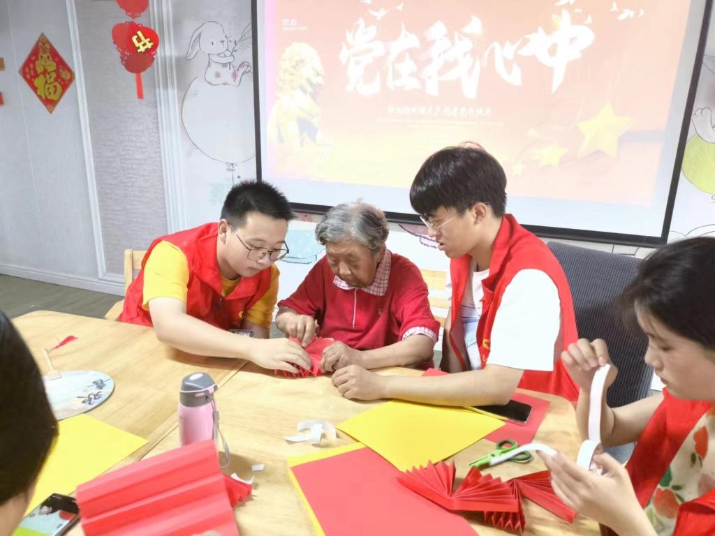 志愿者与老人们一起开展了拼图和折纸活动,共同制作红色手工艺品,现场氛围热烈而温馨。志愿者们耐心地与老人们互动交流,每一件作品都凝聚着大家的用心和深情。最后,志愿者和老人们一同唱响红色歌曲,在悠扬的歌声中本次活动圆满结束。