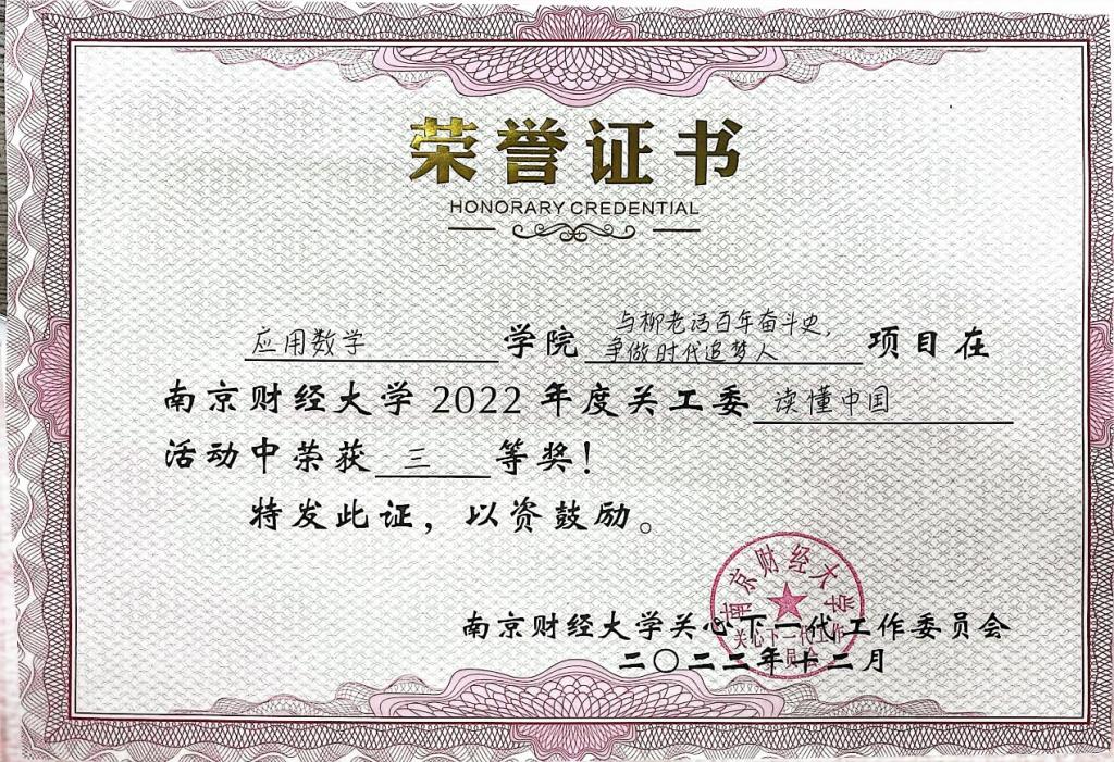 获得校关心下一代工作年度先进集体,“与柳老话百年奋斗史,争做时代追梦人”项目荣获校2022年度关工委“读懂中国”活动三等奖,杨宸宇同学作品《平凡中的伟大》获校2022年度关工委主题征文活动三等奖。