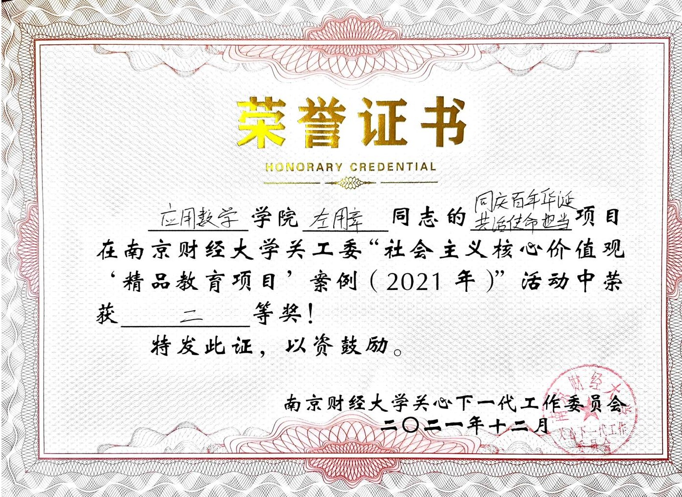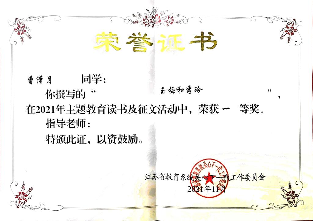 曹潇月同学撰写的“玉梅和秀玲”获省关工委教育读书及征文活动一等奖,“同庆百年华诞 共话使命担当”获校“社会主义核心价值观‘精品教育项目’案例”二等奖,“红色凝聚力量 榜样引导成长”获校“工作创新奖”三等奖,“聆听王老入党初心,共话建党百年历史”获校“读懂中国”征文活动二等奖,“玉梅和秀玲们”获校“主题读书征文”活动一等奖,“‘疫’无反顾 先锋同行”获校“主题读书征文”活动优秀奖。