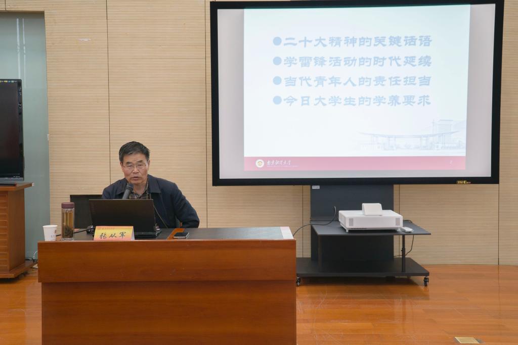 张从军教授以“领悟党的二十大精神,深入贯彻;认真开展学雷锋活动,从我做起。”为题,从党史、新中国史、改革开放史、社会主义发展史中选取若干重大历史事件,对党的二十大的主题,做了深入浅出地阐释。从新时代十年的三件大事:中国共产党成立一百周年、中国特色社会主义进入新时代、完成脱贫攻坚、全面建设小康社会的历史任务中选取与同学们学习生活息息相关的事件引发同学的思考,鼓励同学们珍惜时间,牢记责任担当,提升文化自信。