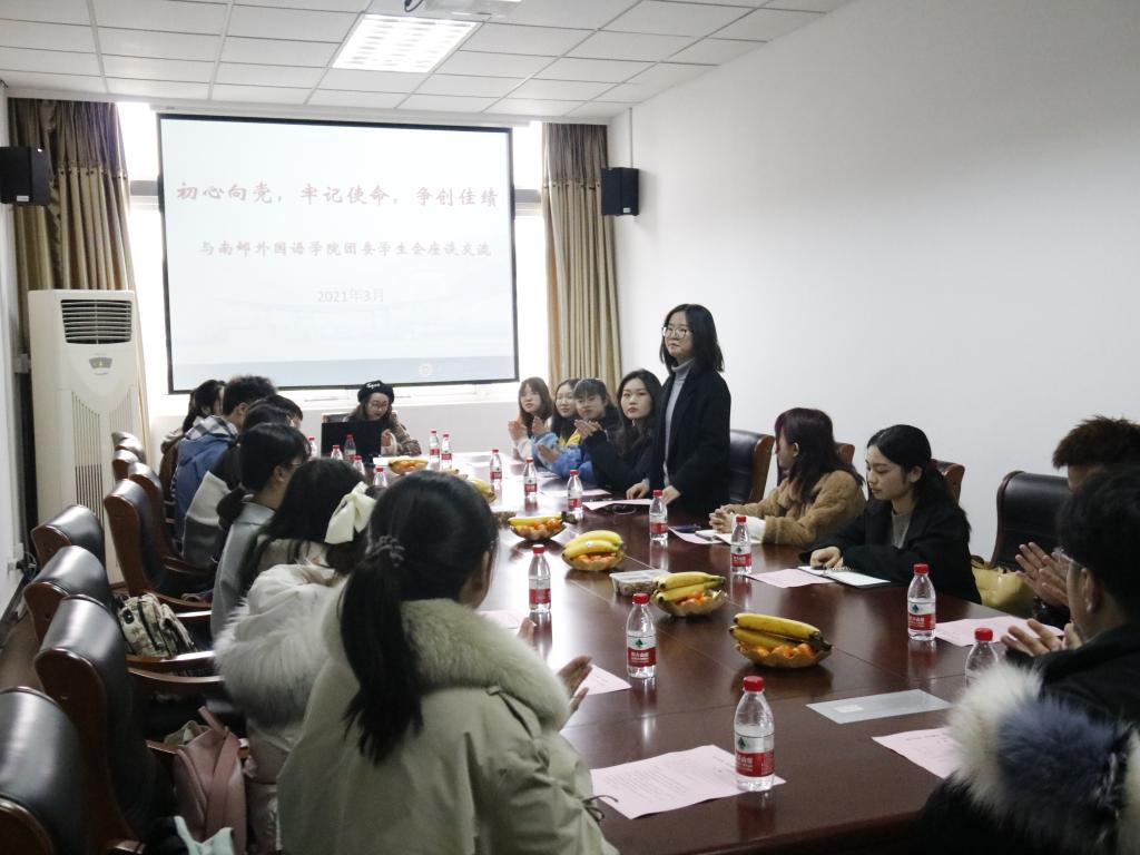 四个学院的分团委、学生会的主要学生干部在仙林校区德业楼301会议室进行了专题座谈交流。南京邮电大学外国语学院学生会副主席贺丽璇、主席赵冰分别介绍了院学生会的工作特色、团队建设、品牌活动等方面的经验。随后,同学们对当前分团委和学生会工作的重点和难点、开拓创新工作思路、跨校联合活动等方面进行了深入交流。