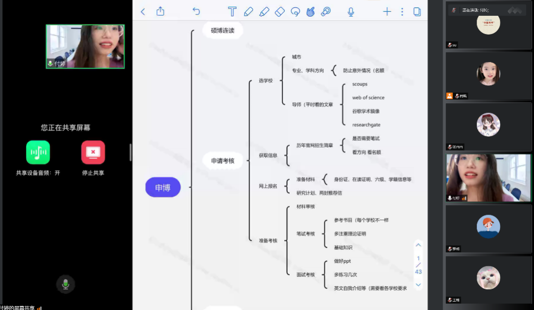 罗成和付婷分别考入西南大学以及国防科技大学攻读博士学位。他们分享了自己在申博时遇到的一些困难,以及在准备阶段的经验和感悟。付婷在谈到申博的三个阶段和材料准备时,绘制了思维导图,清晰明了地展示了各个时间段该完成的任务;罗成则分享了如何给简历增色。他们都衷心地希望大家早日确立目标,并朝着目标不懈奋斗,突破自我,收获成功。