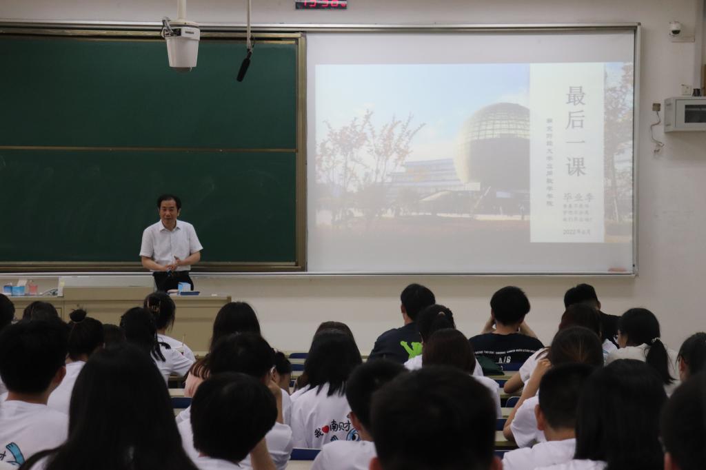 王宏勇院长从回忆初入校园的场景谈起,讲到四年前的“新生入学教育”到今天的“最后一课”,期间是同学们的南财时光,是南财薪火传承与南财学子青春成长的互动交融,更是同学们与时代同行、与南财同路,砥砺青春、奋楫勇进的成长历程。他希望,同学们心怀家国、心怀世界,无畏逆境、赓续奋斗,带着长远的眼光、开阔的胸怀、坚定的信念和奋斗的勇气,为社会贡献青春力量。