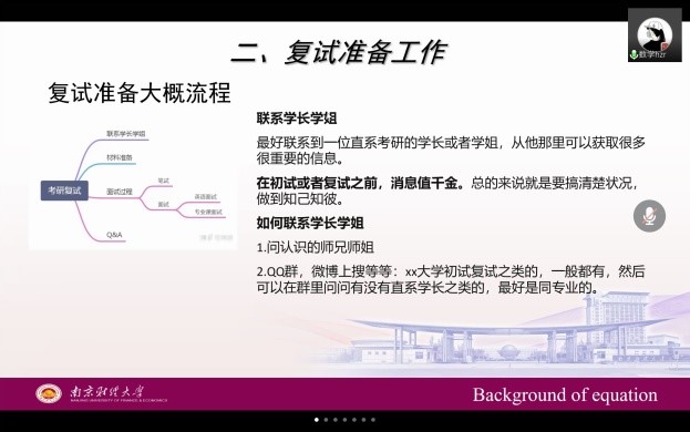 研一党员代表胡钟仁同学,作为南财一志愿上岸的学姐,根据往年的复试经验,精心制作了PPT,对考研复试前的准备工作、复试的基本流程和复试面试时需要注意的细节等进行了全方位的讲解。胡钟仁学姐着重强调了复试时的着装和仪表要求,线上复试时双机位的选择,以及线上复试时可能出现的常见问题等内容,给学弟学妹们提供了详细的讲解。并寄语考研学弟学妹们:“力学如力耕,勤惰尔自知,但使书种多,会有岁稔时。”