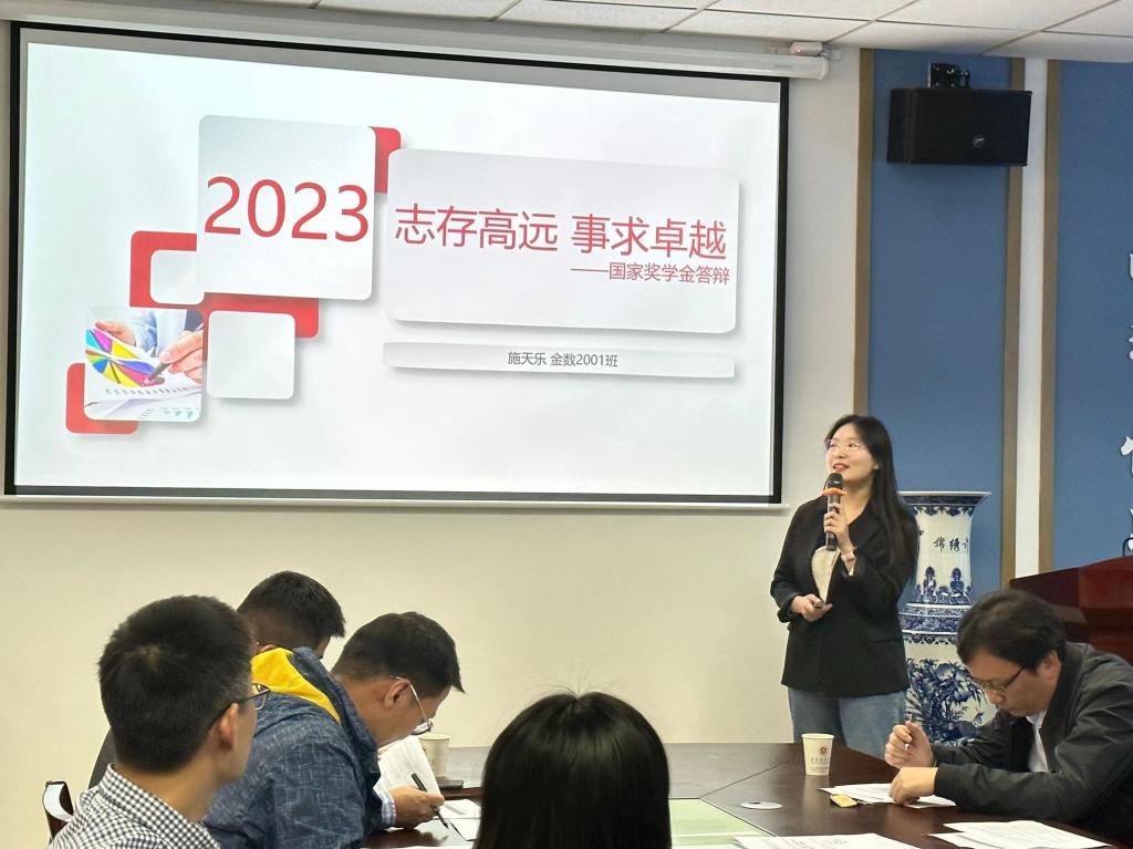 来自金数2001班的候选人吴琼说道:“仰望星空,脚踏实地;仰之弥高,钻之弥坚;朝乾夕惕,功不唐捐;知行合一,躬身实践。”她用三年的努力,尽力交出了最优秀的答卷。来自金数2001班的施天乐说道:“书山有路勤为尽”,正是她的勤奋努力,在三年的大学生活中获得多项荣誉并成为ACCA准会员。答辩会结束后,本着公平公正的原则,评审小组将严格筛选,认真评定,确定一名本科生国家奖学金获得人选。