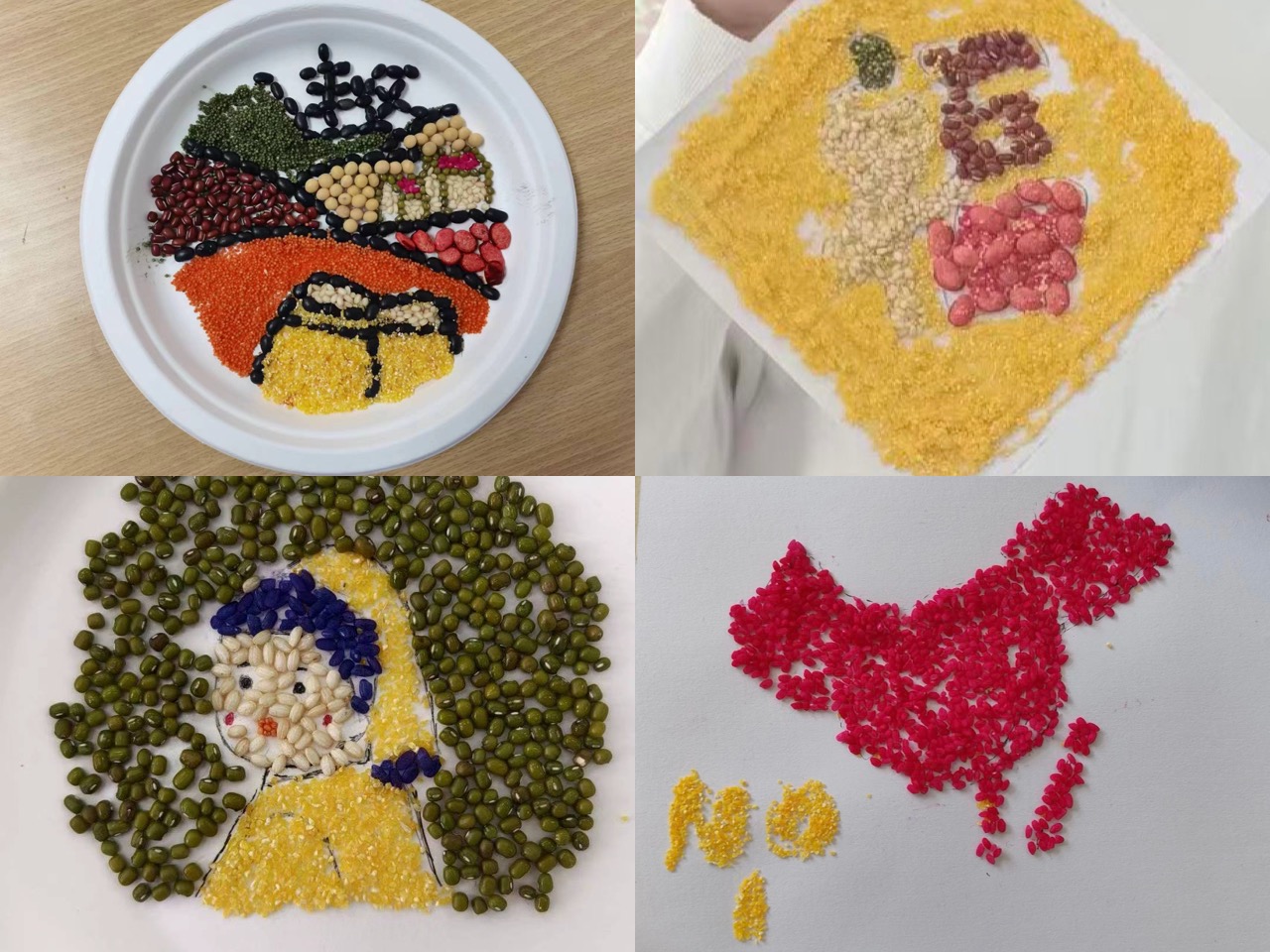 活动伊始,刘昱辰老师通过线上与线下相结合的方式作了“劳动最崇高”主题宣讲,带领同学们学习习近平总书记在全国劳动模范和先进工作者表彰大会上的重要讲话,引导同学们向劳动者致敬,传承新时代劳动精神,激励同学们牢记习近平总书记的嘱托,继续精进学业水平,大力弘扬劳模精神、劳动精神、工匠精神,牢固树立马克思主义劳动观。继而,刘老师和同学们一起制作五谷杂粮画。大家先在硬纸上用铅笔勾勒出象征着“劳动”的画作轮廓,接着,将胶水沿着轮廓形状均匀涂开,最后把不同颜色的五谷杂粮种子粘贴在相应的位置,一幅幅色彩鲜明而又意义非凡的作品便诞生了。制作完成后,大家选出了优秀画作的作者上台讲解他们使用的五谷杂粮的名称、产地以及相关的历史名人故事,并发表他们各自制作五谷杂粮画的想法和灵感以及对于新时代劳动精神的理解与认识。江宇森同学讲到:“‘时代飞速向前,但劳动之美,永不褪色’,希望劳动精神能在新时代继续绽放光彩。”