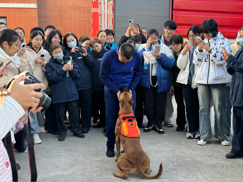 最后,消防搜救犬在训导员指令下,完成了废墟搜救、服从性训练等展示,反应敏捷、动作迅速,赢得阵阵掌声。训导员还介绍了搜救犬的训练过程及其在应急救援中的重要作用,展现出犬与人的默契配合,也让同学们体会到消防救援工作的艰辛。