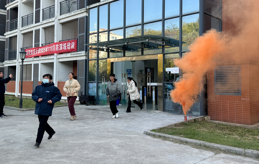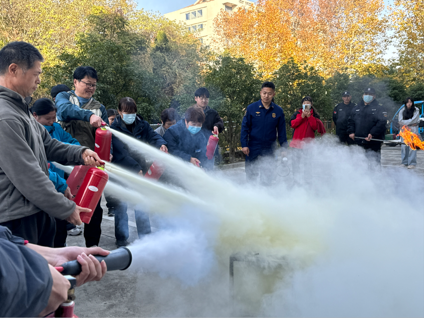 消防演习率先开始。模拟火灾警报响起后,参加演习的师生在教官的指引下,用湿毛巾捂住口鼻,低姿弯腰,沿疏散路线迅速、有序撤离至安全区域。整个过程紧张有序,大家纪律严明,通过亲身体验掌握了正确的逃生与自救方法。