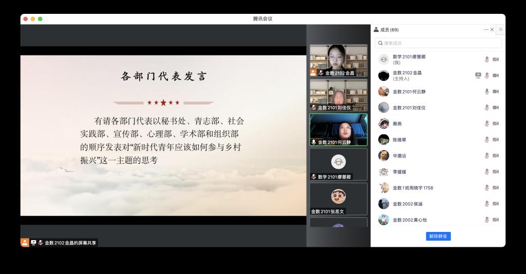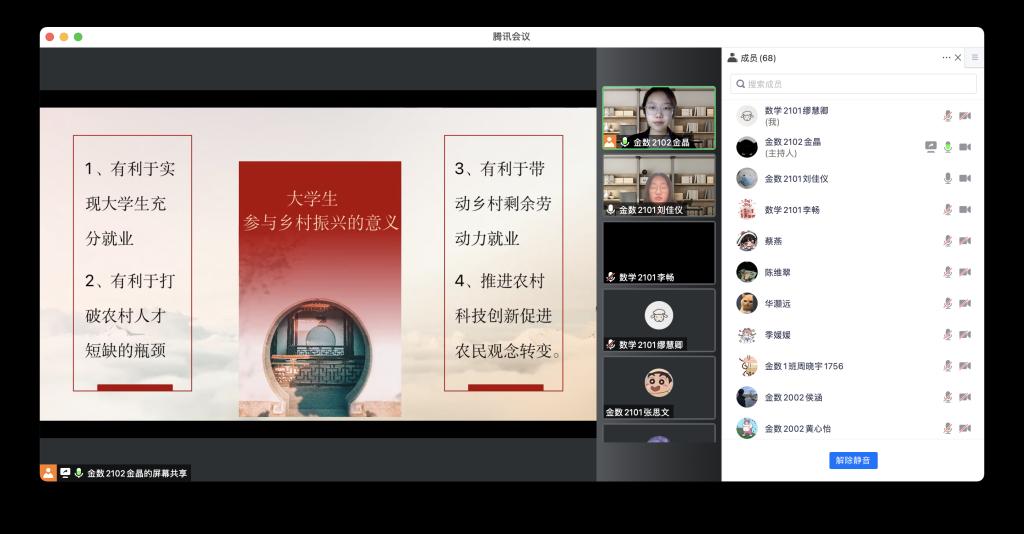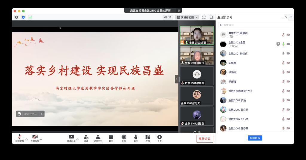在云端开展以“落实乡村建设,实现民族昌盛”为主题的信仰公开课,公开课由院团委组织部金晶、刘佳仪同学主持,院团委全体成员参加。