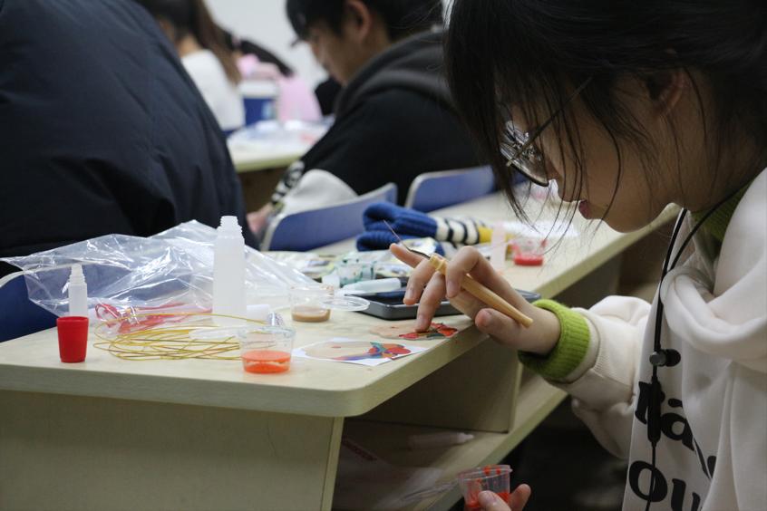 活动围绕学习制作掐丝珐琅画开展,主要有珐琅画历史与工艺介绍、珐琅画亲手制作、新年展望三个环节。现场主持人首先向参加的同学们介绍了掐丝珐琅画的历史背景和制作流程,强调了其中的掐丝和点蓝两大关键步骤。在掐丝环节,同学们需运用细致的技巧,利用细铁丝在画布上勾勒出精美的图案;在点蓝环节则要求他们将不同颜色的珐琅粉精准填涂于图案中,以呈现出丰富多彩的效果。同学们踊跃参与尝试制作,他们的作品展现了出色的创意和想象力,有的以掐丝技艺描绘出迷人的祥云图案,有的则通过点蓝技巧勾勒出栩栩如生的动物形象。活动在同学们书写新年愿望时迎来了高潮,每个人都表达了对即将到来的新一年的期待、目标和希望。