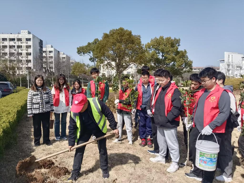 活动分为讲解说明和实际操作两个环节。志愿者们领取好劳动工具后,后勤基建处负责老师向同学们详细讲解了桂花树苗的种植流程,现场示范了操作细节和注意事项。
