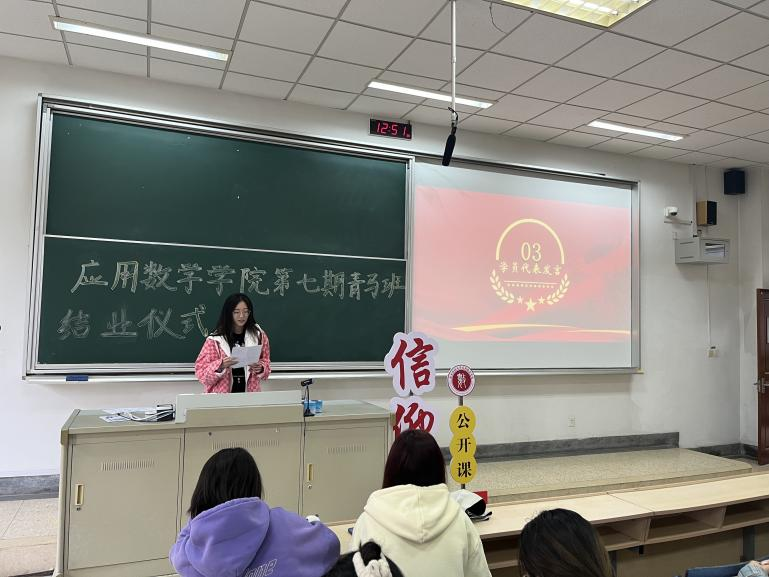 优秀学员代表李天妍发言,她说:“青马班为我们打开了一扇认识世界、认识自我、认识社会的大门,为我们提供了一个宽广的平台,让我们得以系统地学习马克思主义理论,深入了解党的路线方针政策,增强了我们的政治觉悟和思想认识。”并表示愿与全体学员一道以更加饱满的热情、更加坚定的信念,携手共进,在各自的岗位上绽放出耀眼的光芒,为党和人民的事业谱写出更加辉煌的篇章。