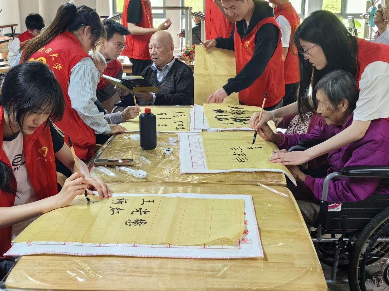 笔墨留痕。志愿者与老人共同进行书法创作,国风浓厚的毛笔字让大家跨越了年龄的鸿沟,宣纸与墨汁的碰撞也拉近了同学们与老人的距离,同学们惊叹于老人们的笔法力透纸背、入木三分,老人们也热情地将经验和技法传授给同学们,大家在切磋交流中感受着毛笔的起落顿挫,享受运墨收笔、体会一撇一捺间蕴含的人生哲理。