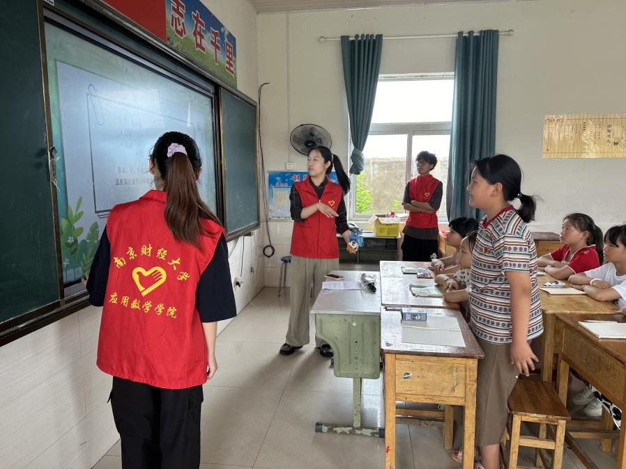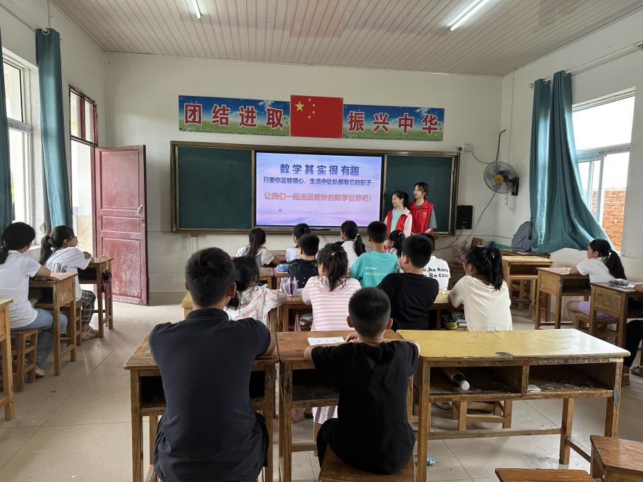 7月4日上午,实践团队分两个教学班对石羊小学四、五年级共50余名小朋友开展支教。趣味数学课上,志愿者通过数学典故、数学游戏、教具操作等方式带领同学们探索数学奥秘和乐趣;通过多媒体演示、板书讲解、小组讨论、问答等形式充分调动同学们的积极性,培养同学们的数学思维。暑期安全教育和心理健康教育课上,志愿者从防溺水、交通安全、防灾减灾等方面,立足当地实际开展暑期安全教育;从心理知识普及、心理问题预防、发现和调试等方面深入浅出地教会小朋友们如何应对“情绪小怪兽”。志愿者还为同学们准备了丰富的小礼品,课堂上时时传来阵阵欢声笑语。当天暴雨倾盆,但是丝毫没有影响团队成员和小朋友们的热情,许多家长冒雨送小孩前来,有位老奶奶激动地说:“那么大的雨,路那么不好走,你们还坚持上课,再大的雨我也要送家里的小孙子过来。”