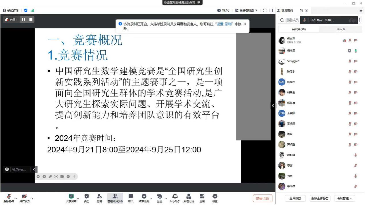 经济数学实验室主任杨靖三老师系统介绍了本次研究生数学建模大赛的赛程安排和数学建模论文的撰写技巧,并从评审要点的角度剖析了论文写作中的关键问题。此外,他还分享了历年竞赛中常见问题的解决方案,鼓励同学们扎实学习、积累经验,以全面提升竞赛能力。杨靖三老师最后号召大家积极参与全国数学建模竞赛,通过以赛促学提升个人综合能力。参会学生纷纷表示受益匪浅,对即将到来的比赛充满信心。